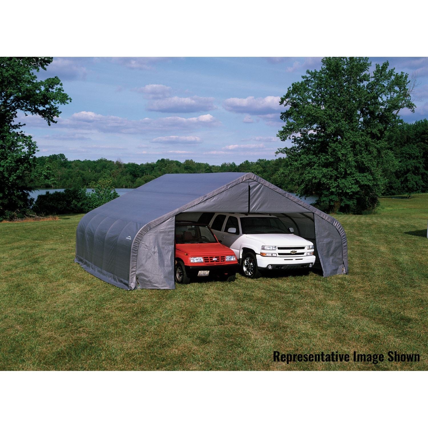 A: This is a robust, all-weather portable garage designed to protect large vehicles, equipment, and supplies. Its peak-style roof offers additional storage height, and the gray cover provides a sleek, neutral appearance.