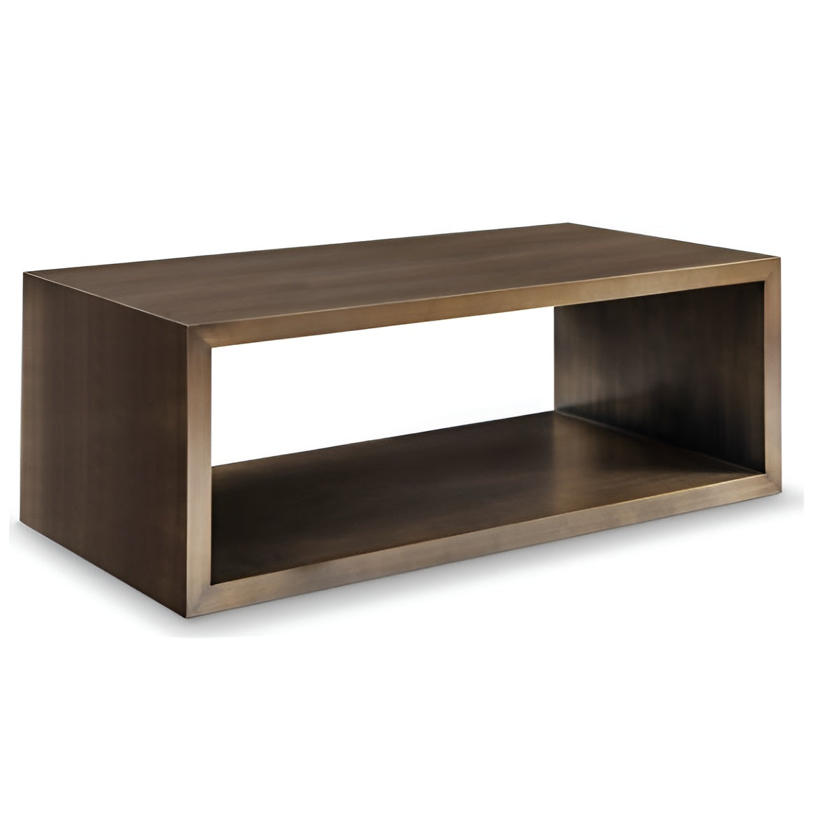 The "Piero" cocktail table is a beautifully scaled simple rectangular form. Both horizontal surfaces are usable for storage, display, or to hold a glass or cup. The material is stainless steel with a hand applied antique oiled Bronze finish that gives this table a handsome ageless quality. This is a modernist masterpiece of refined simple form. The Antique bronze finish makes this table a beautiful addition to any interior. Award winning furniture designer; Greg Sheres, has been designing timeless classics for over 30 years.