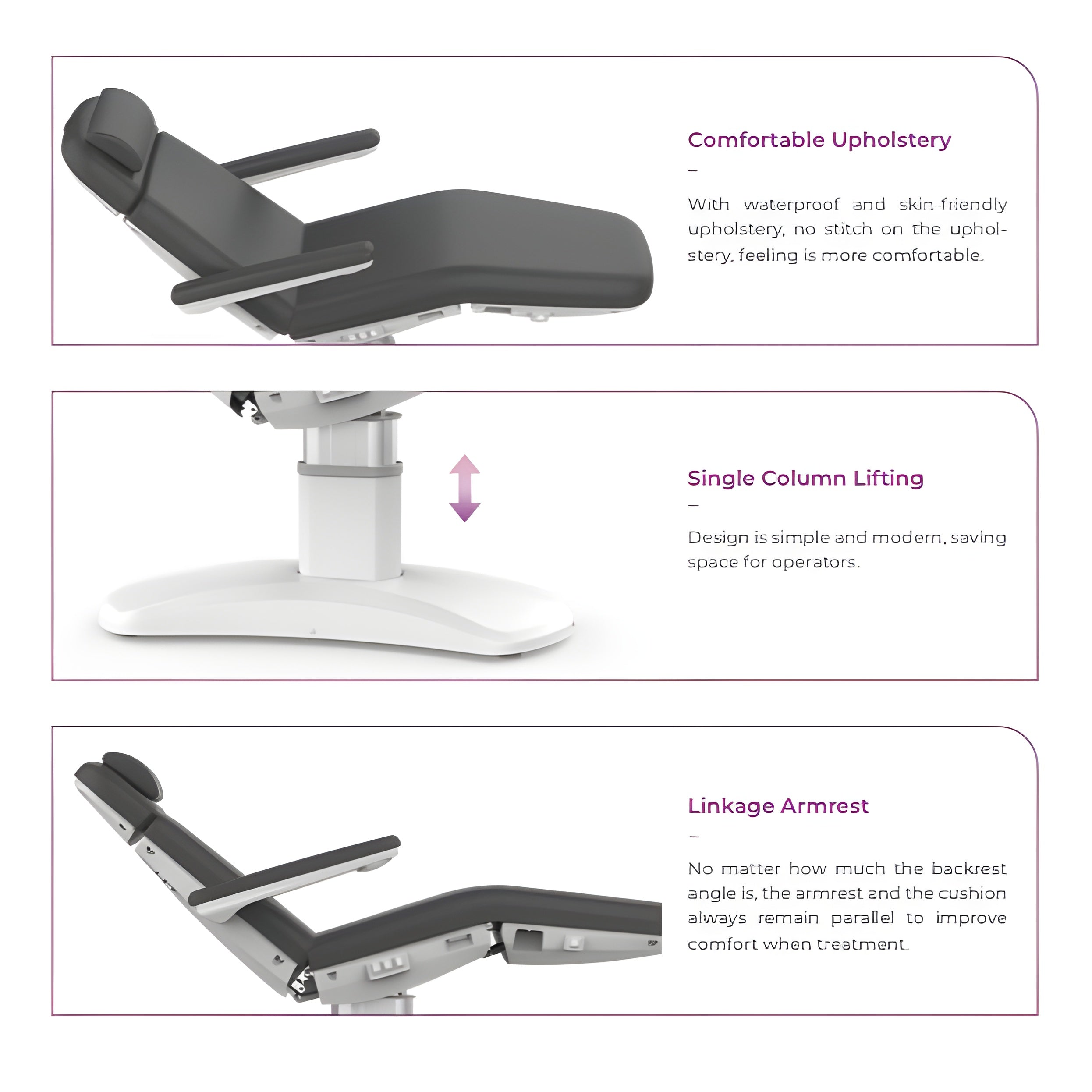 A: Yes, the dark grey vinyl upholstery is easy to wipe clean, making it a practical choice for busy spa and medical environments where hygiene is essential.