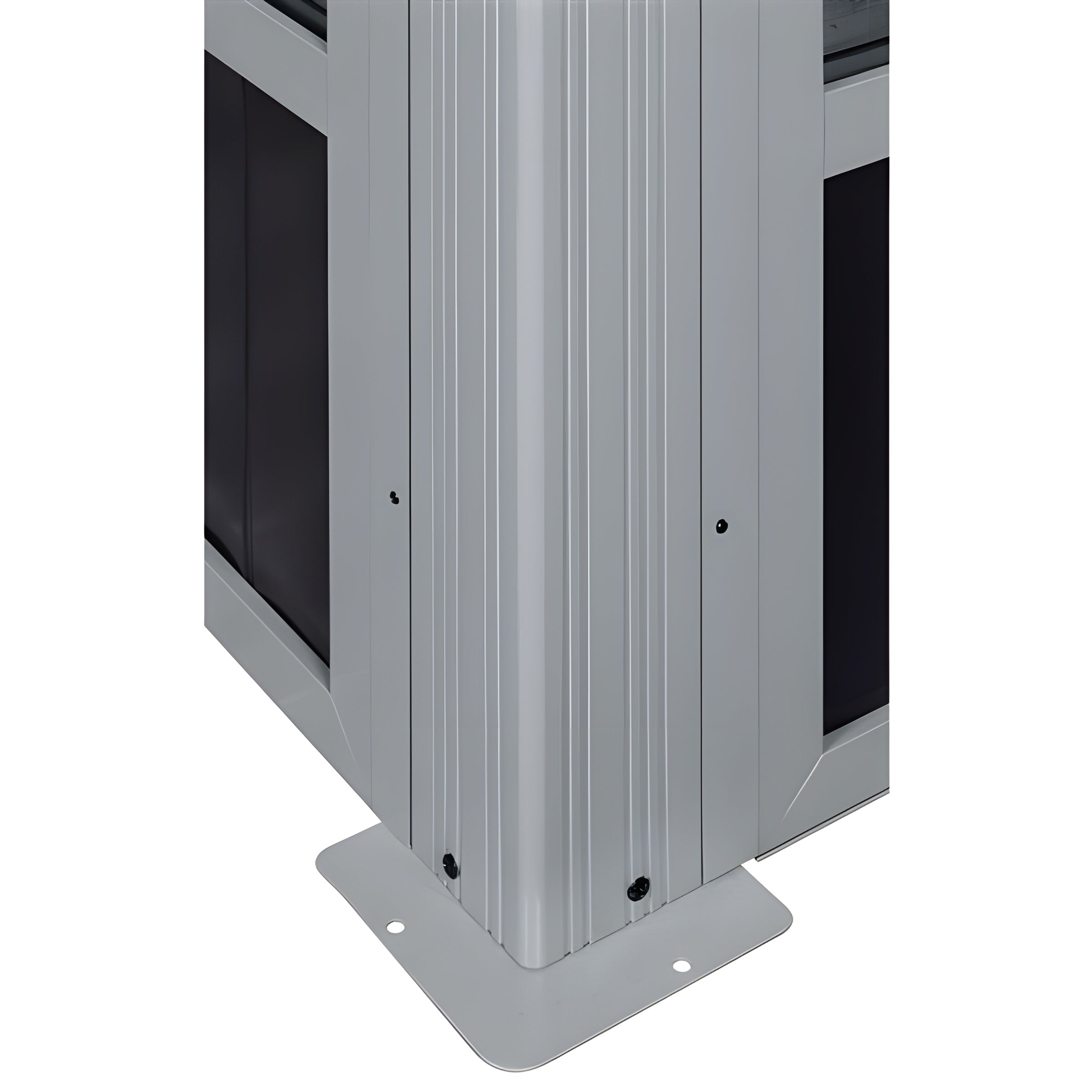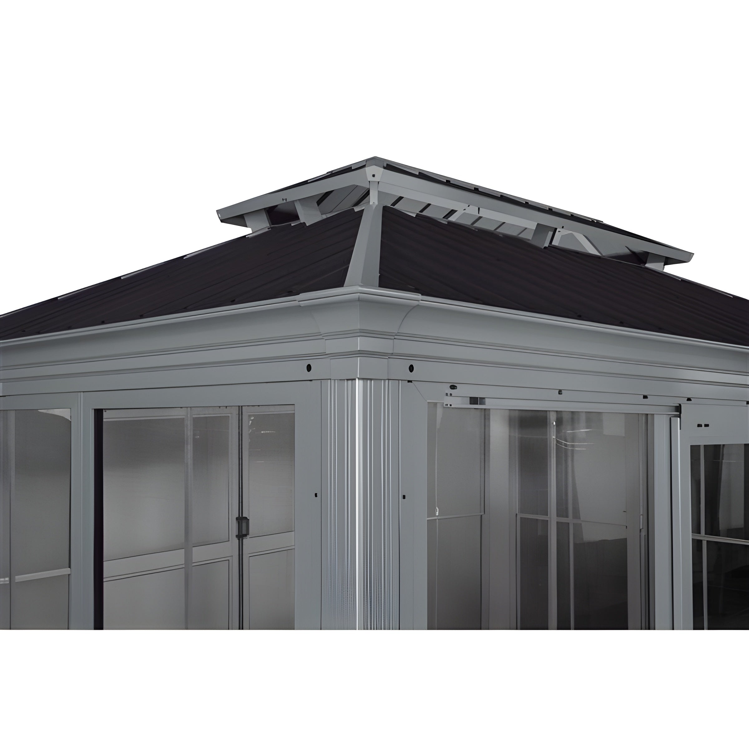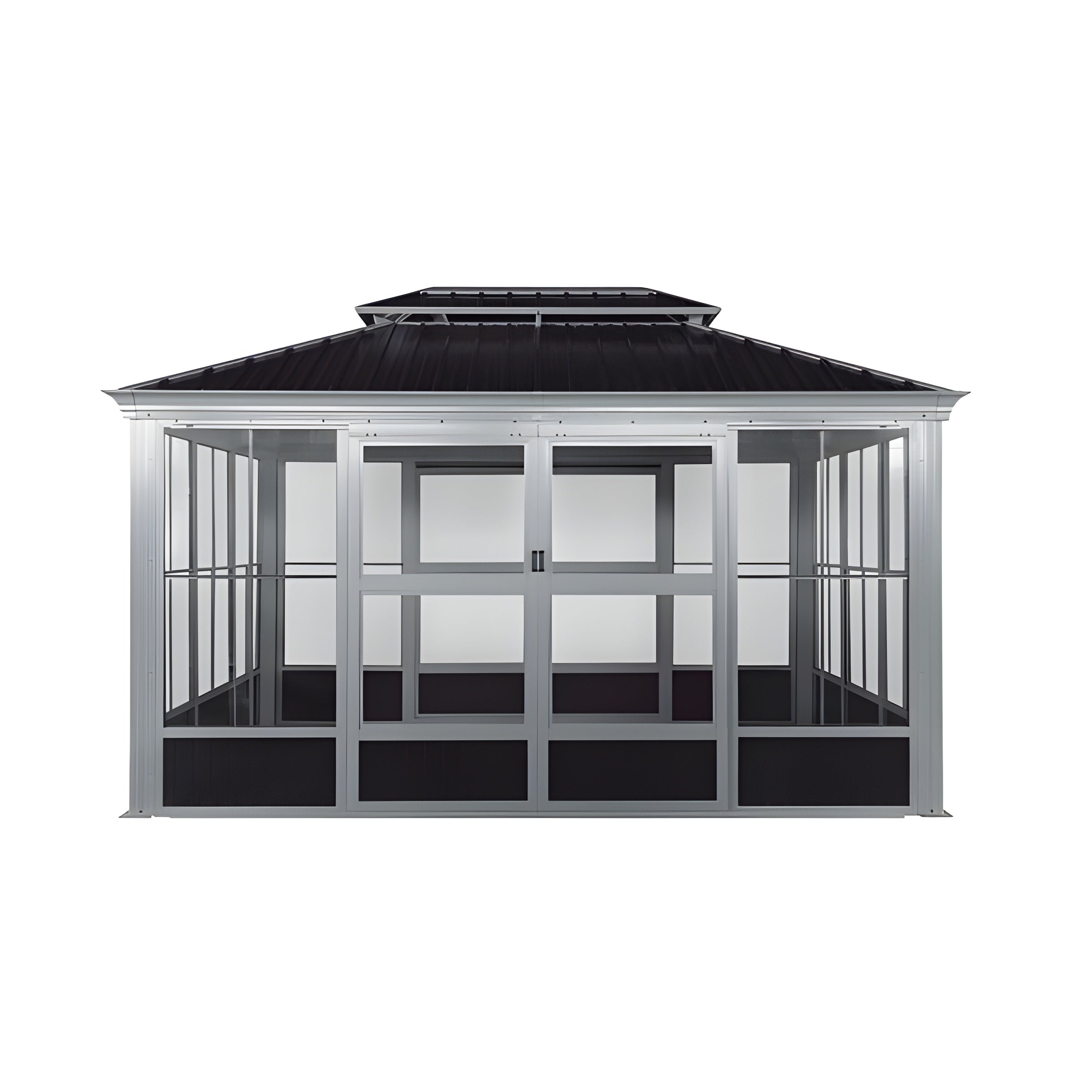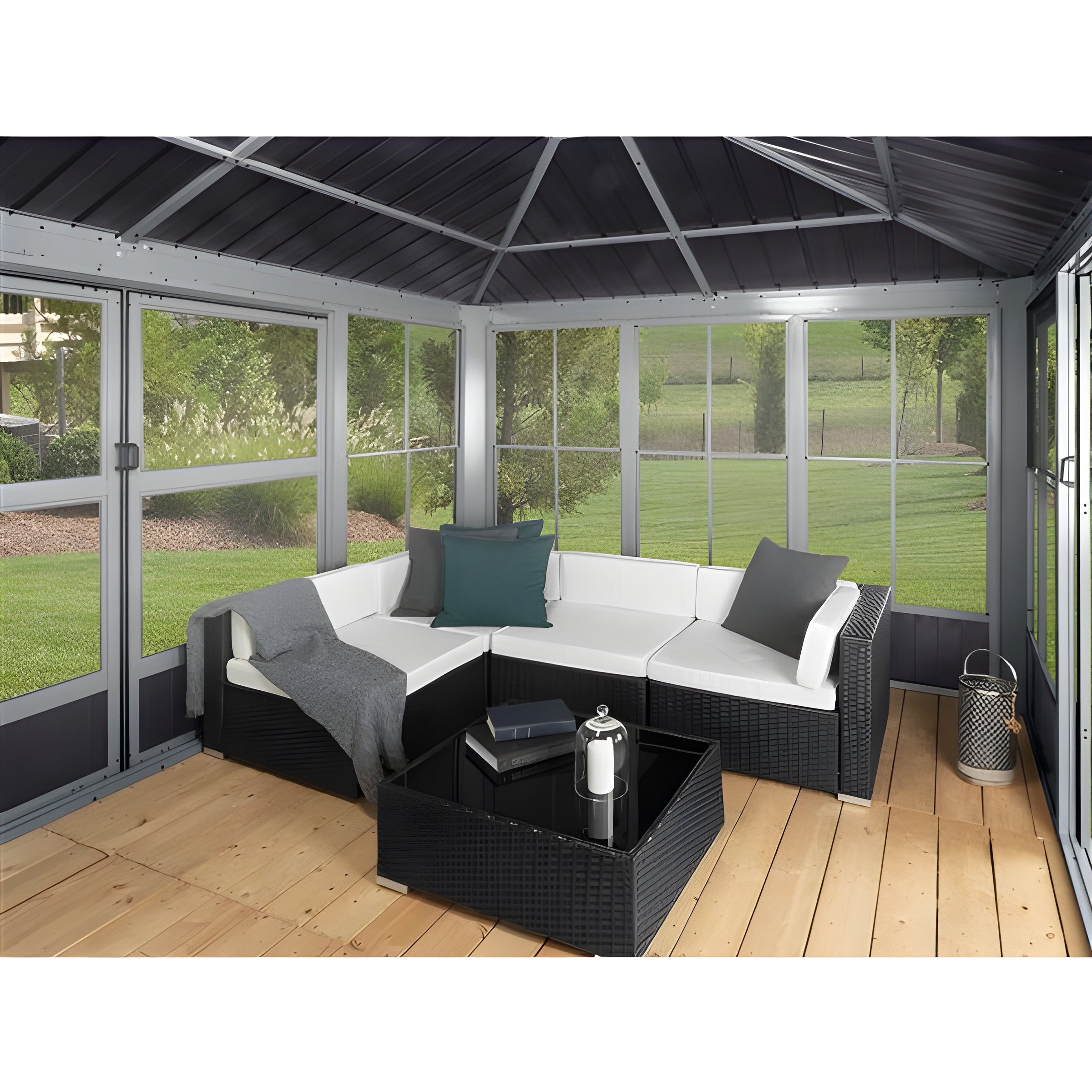 Create your private oasis, away from home, in your own backyard. With the 4 season Bolata solarium, you will be protected from the sun, rain, mosquitos and even snow, all while being surrounded by the beautiful outdoors. Its sturdy aluminum structure and galvanized steel roof will last for years to come. The Bolata features a double roof and 2 double sliding doors, allowing for additional air circulation. Each wall panel is equipped with netting and mica plastic windows. Enjoy as an outdoor extension to your living room or dining room in any weather!