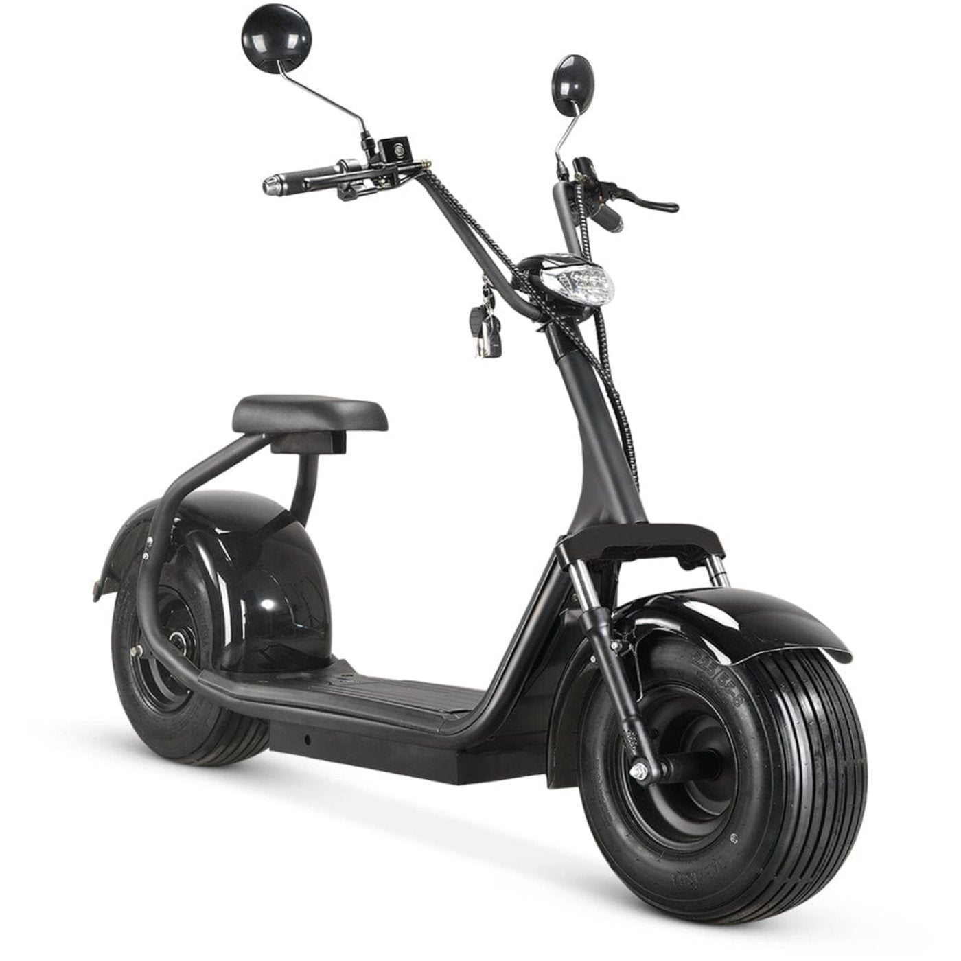 The Hydraulic shock front fork is fully adjustable. In addition, the 8 inch tubeless fat tires decreases the braking distance and risk of puncture.