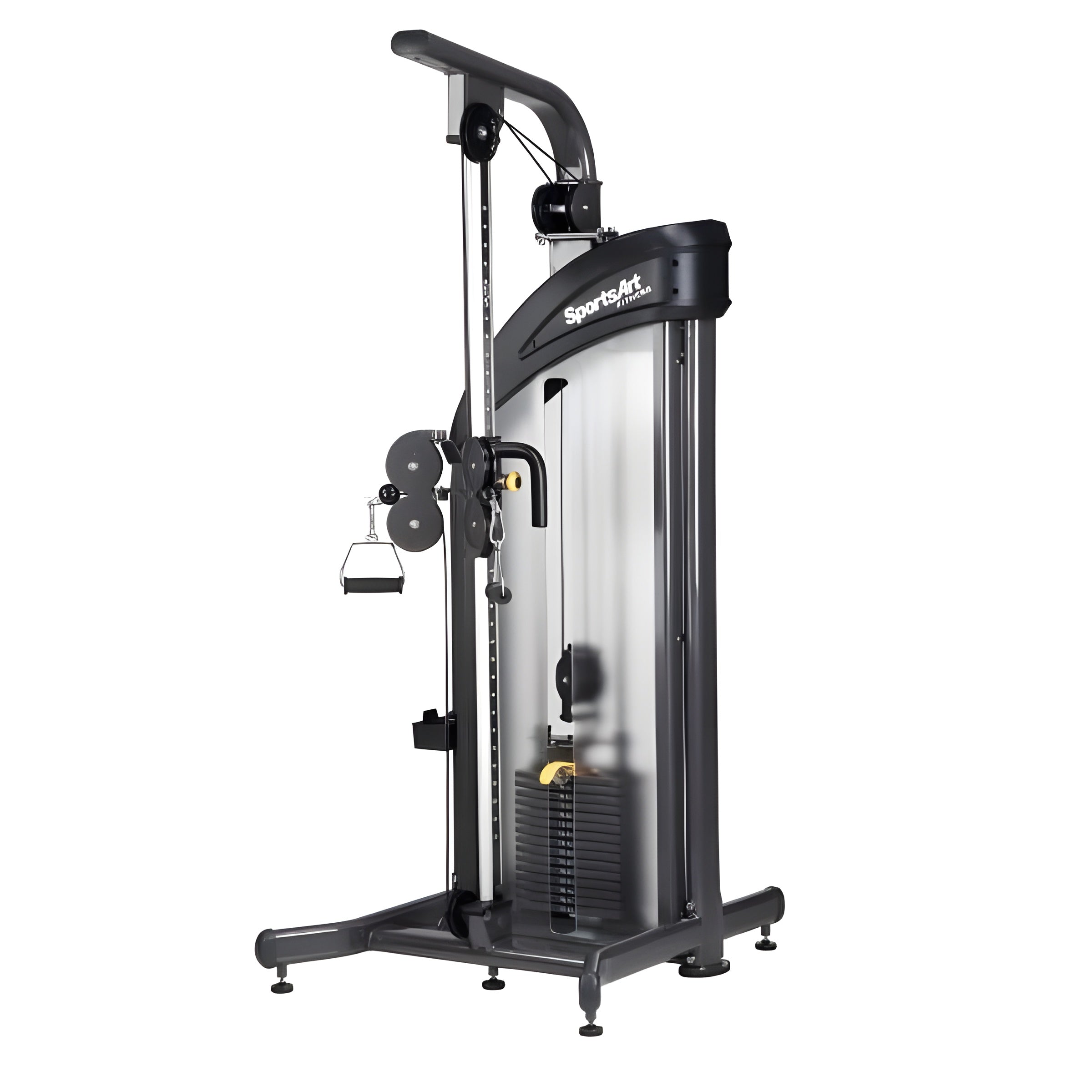 Dual swivel pulleys adjust vertically and lock into place, allowing for functional training from virtually any angle
