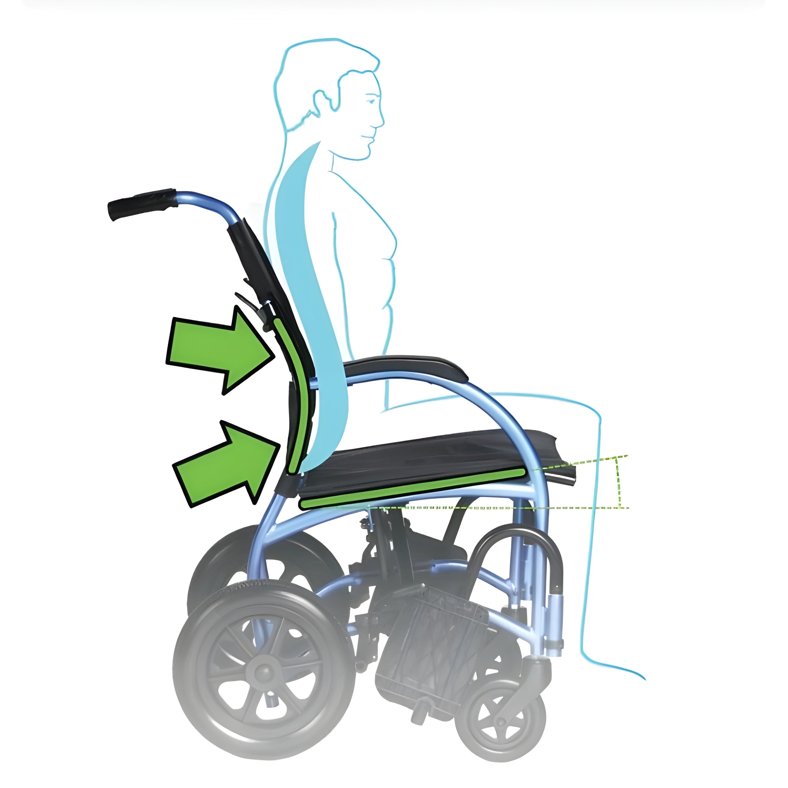 Strongback wheelchair conforms to and supports the natural and healthy lumbar curve of the spine thus preventing the user from slouching forward and squeezing spinal discs with a tremendous amount of unhealthy pressure - decreasing this pressure results in healthier discs, a stronger back, and long-lasting comfort while seated.