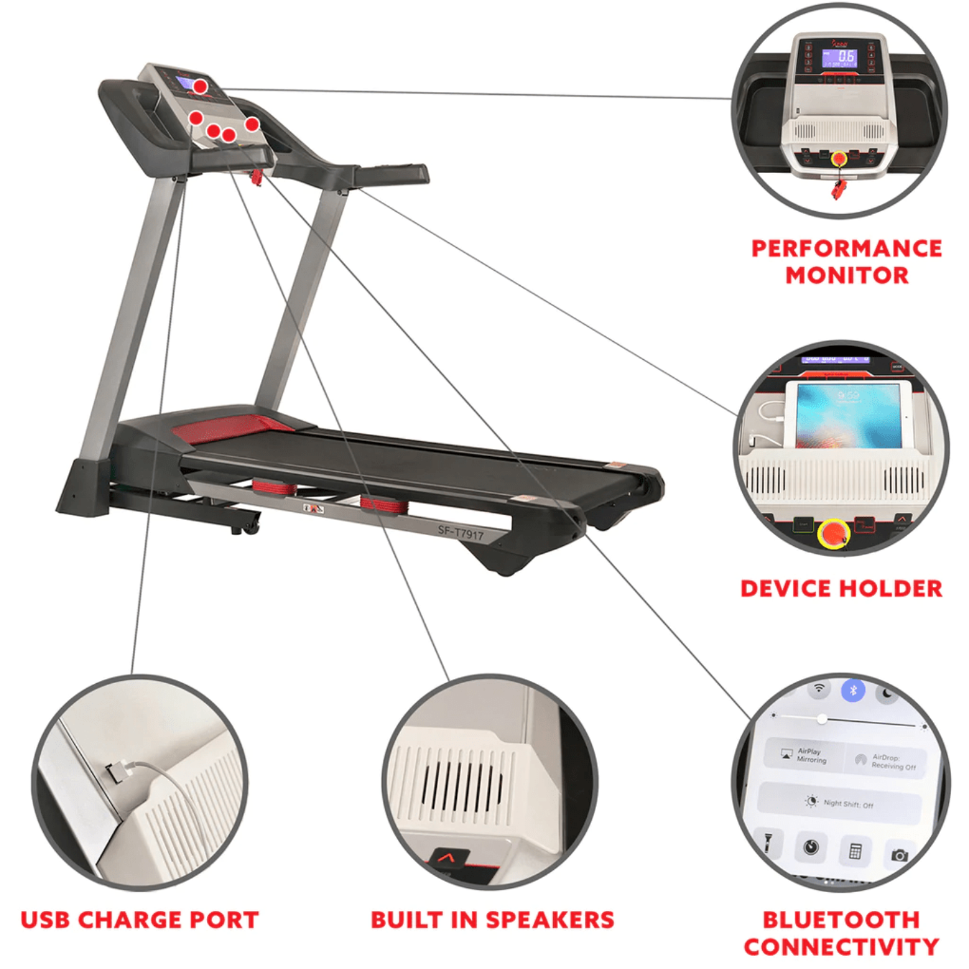 Run, walk, or dash to your fitness goals with the Sunny Health & Fitness SF-T7917 performance treadmill. Exercise comfortably on the spacious (52L x 19W in) treadmill deck with built-in shock absorption technology that eases impact on leg joints as you exercise on the in-home treadmill. Designed for vigorous and long-lasting workouts, this incline treadmill supports up to 265 lb. Powered by a 2.0-peak horsepower motor, the wide treadmill operates between 0.6 MPH and 10 MPH. Increase workout intensity on the fly with 15 levels of automatic incline. Make quick adjustments to your speed and incline with the convenient handrail controls and the quick buttons on the console. View your heart rate quickly on the cardio machine when you grab the hand pulse grips. Track your time, distance, speed, pulse, incline, and calories-burned on the built-in performance monitor. Want to mix up your workout? Take advantage of 15 pre-installed workouts that automatically adjust speed and incline.