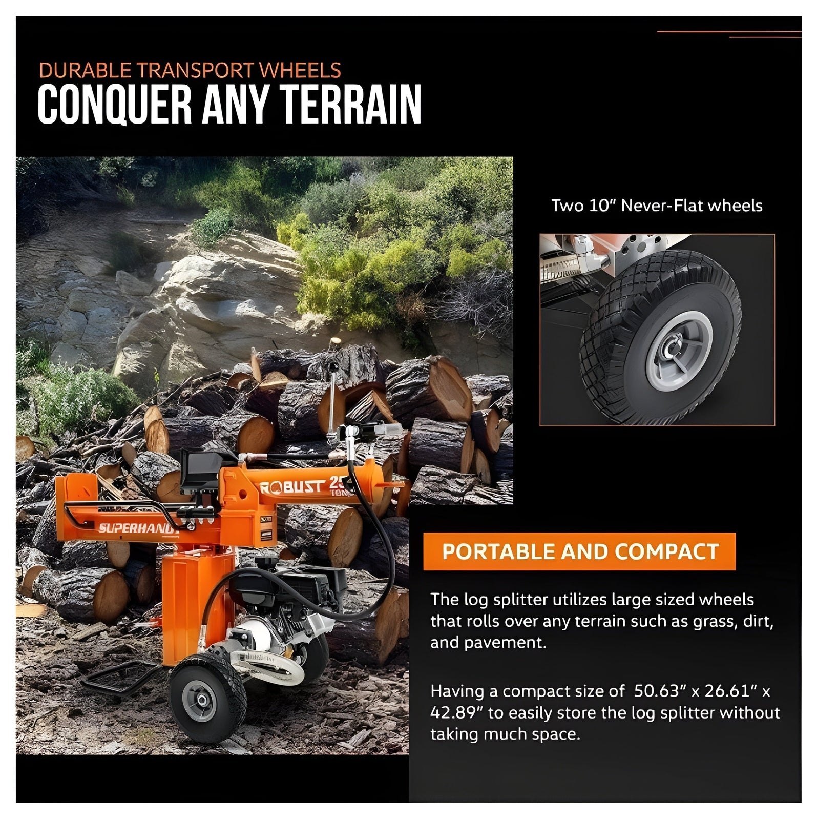 Super Handy Portable 25-Ton Gas Log Splitter. Tear through logs up to 20 inches in length and 16 inches in diameter! Get it done twice as fast with our Rapid Auto Return push-rod. Don't take our word for it, see for yourself in the video above!