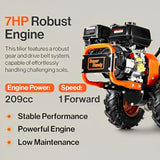 A: It is powered by a 7HP 209cc 4-stroke gas engine, providing reliable power for tough soil and garden tasks.