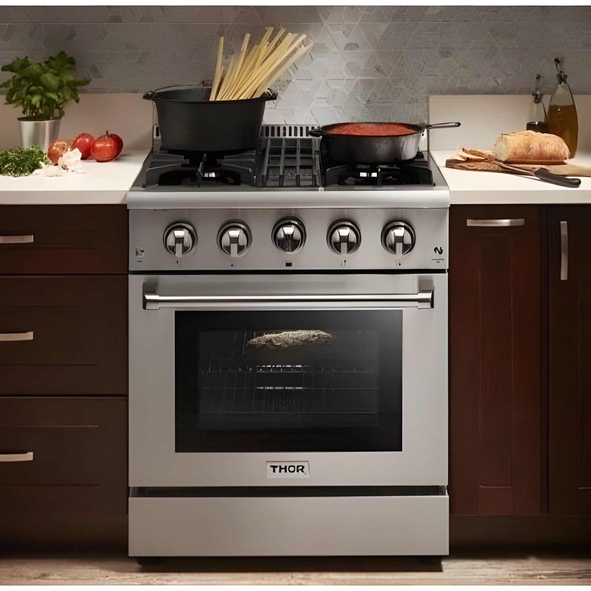 This THOR Kitchen 30 in. Professional Style Dual Fuel Range (HRD3088ULP) will fulfill all your cooking desires. This unit features a total of 57,000 BTU professional Italian burners, includes an electric powered 4.2 cu. ft. oven to attain the most accurate desired temperatures, is equipped with a convection fan, and continuous grating to facilitate the movement of large cookware.