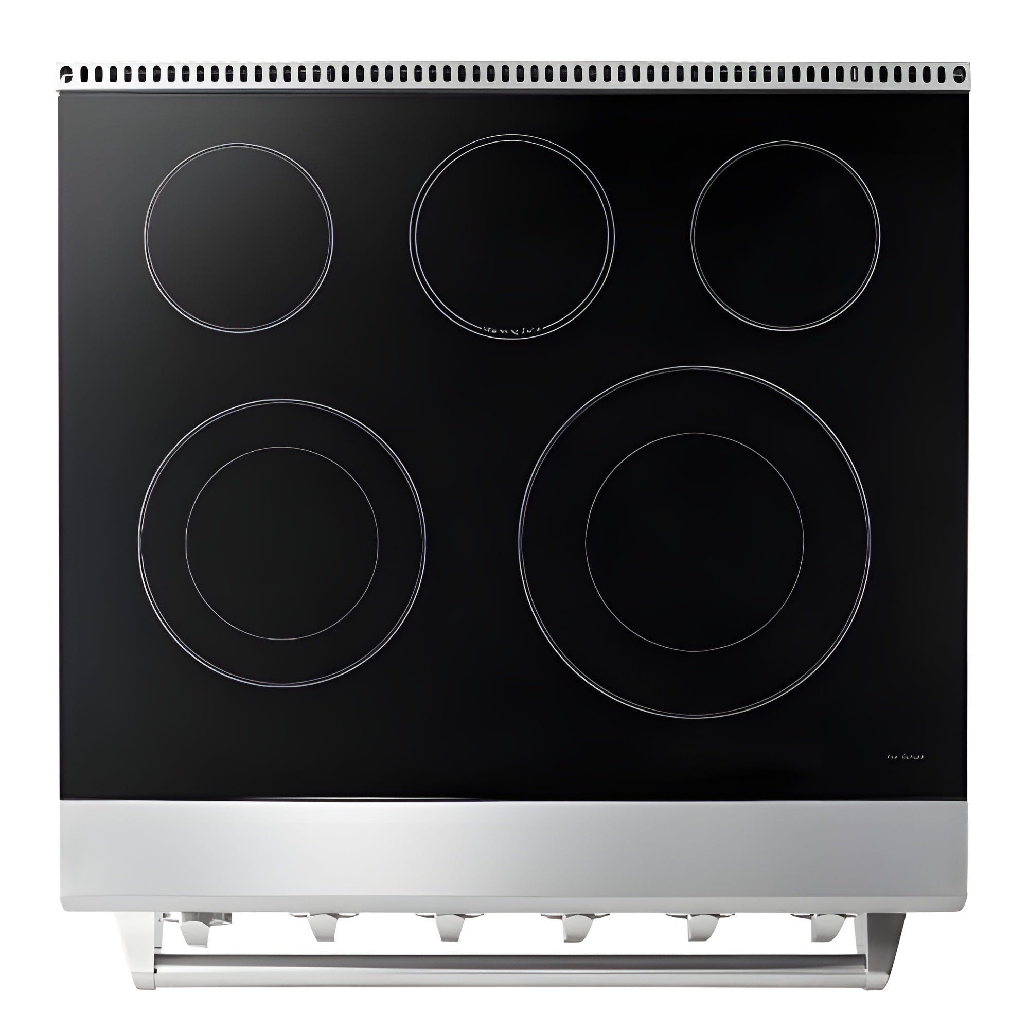 Smooth Glass Top. Easy to fit in a 30-Inch space, this freestanding professional electric range features a frameless glass top that is flush with the countertop giving it a seamless look that is easy to clean