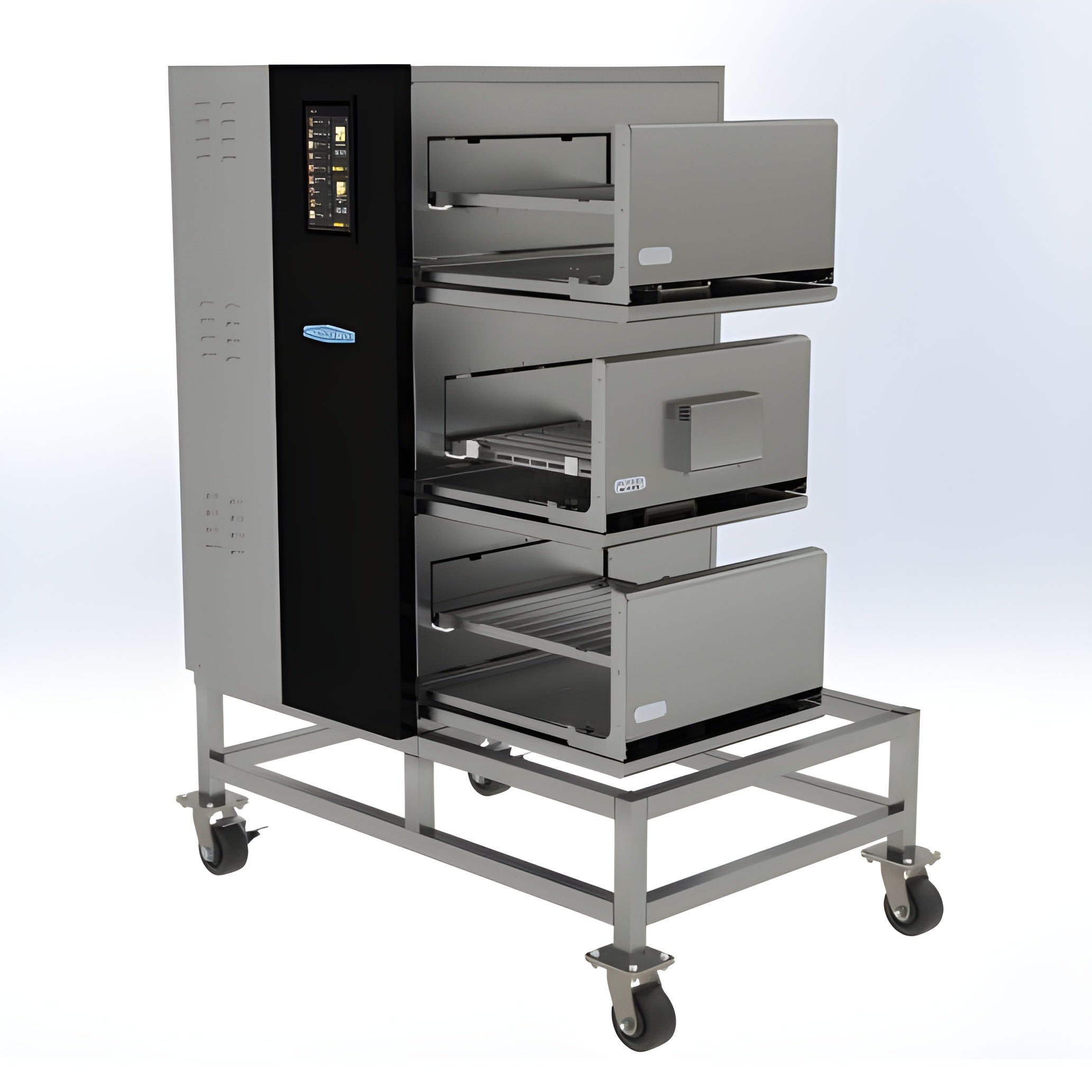 TurboChef, PLE-9500-1-DL-ICR, Plexor Combination Oven, 3 decks, impinged air / convection / rapid cook combination type, ventless, electric, 48.88" wide, right load, touch screen, Middleby Connect wifi ready, store over 1,000 recipes via USB or wifi, digital timer, autoload/unload, variable speed blower motor, top-launched microwave, internal catalytic converter, stainless steel exterior finish, includes open stand with castors, 208-240v/60/3-ph, 50 amps, NEMA 15-50P.