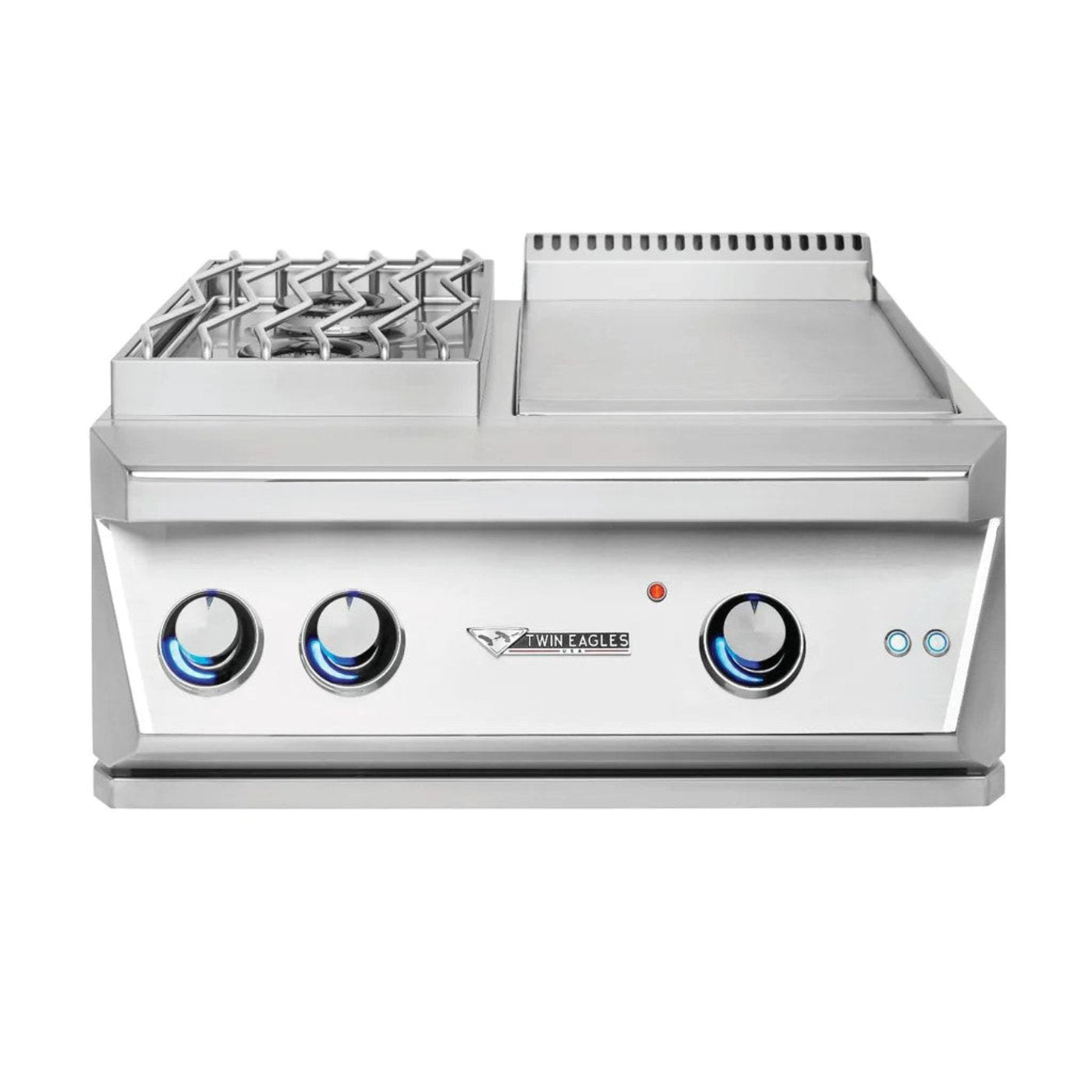 Elevate your outdoor cooking experience with the Twin Eagles TEBC30-CL 30" Dine & Breakfast Club, a versatile propane gas griddle and double side burner combo. This innovative unit seamlessly integrates with your existing grill, transforming your outdoor space into a culinary haven that allows you to entertain from morning to night.
