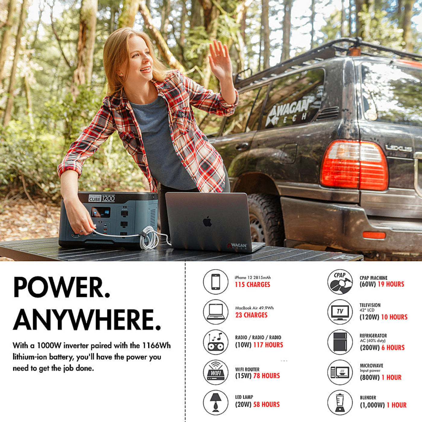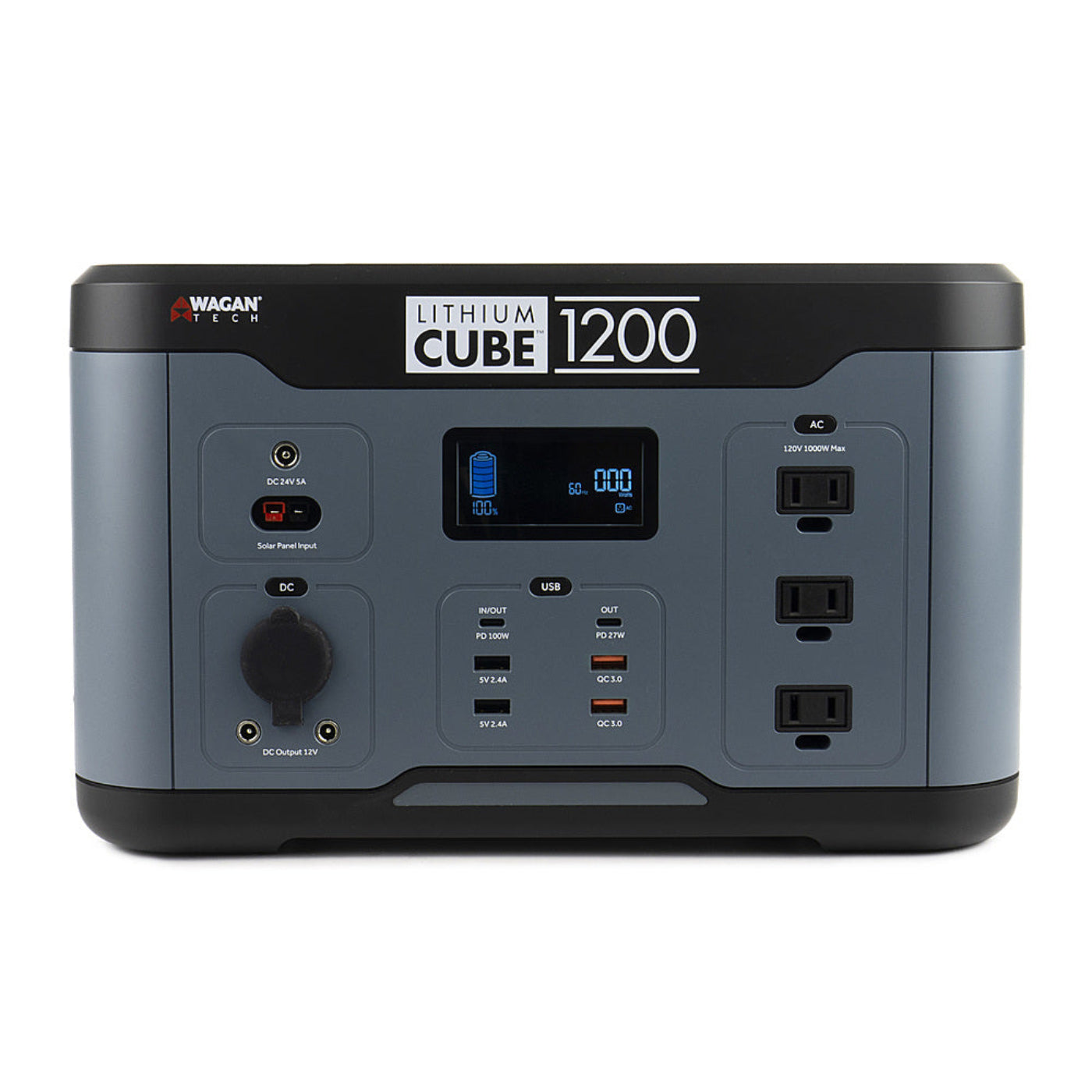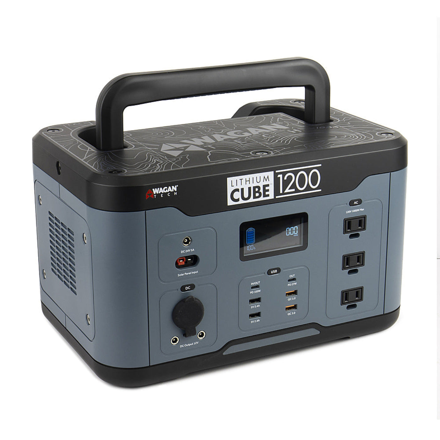 Wagan Lithium Cube 1200 is an all-in-one power supply with a 1166 Wh lithium-ion battery and a 1000 watt pure sine power inverter. The Lithium Cube 1200 can charge all your devices on-the-go with 3 AC outlets, 6 USB, 2 DC 5.5 mm barrel outputs, and 1 DC socket.