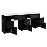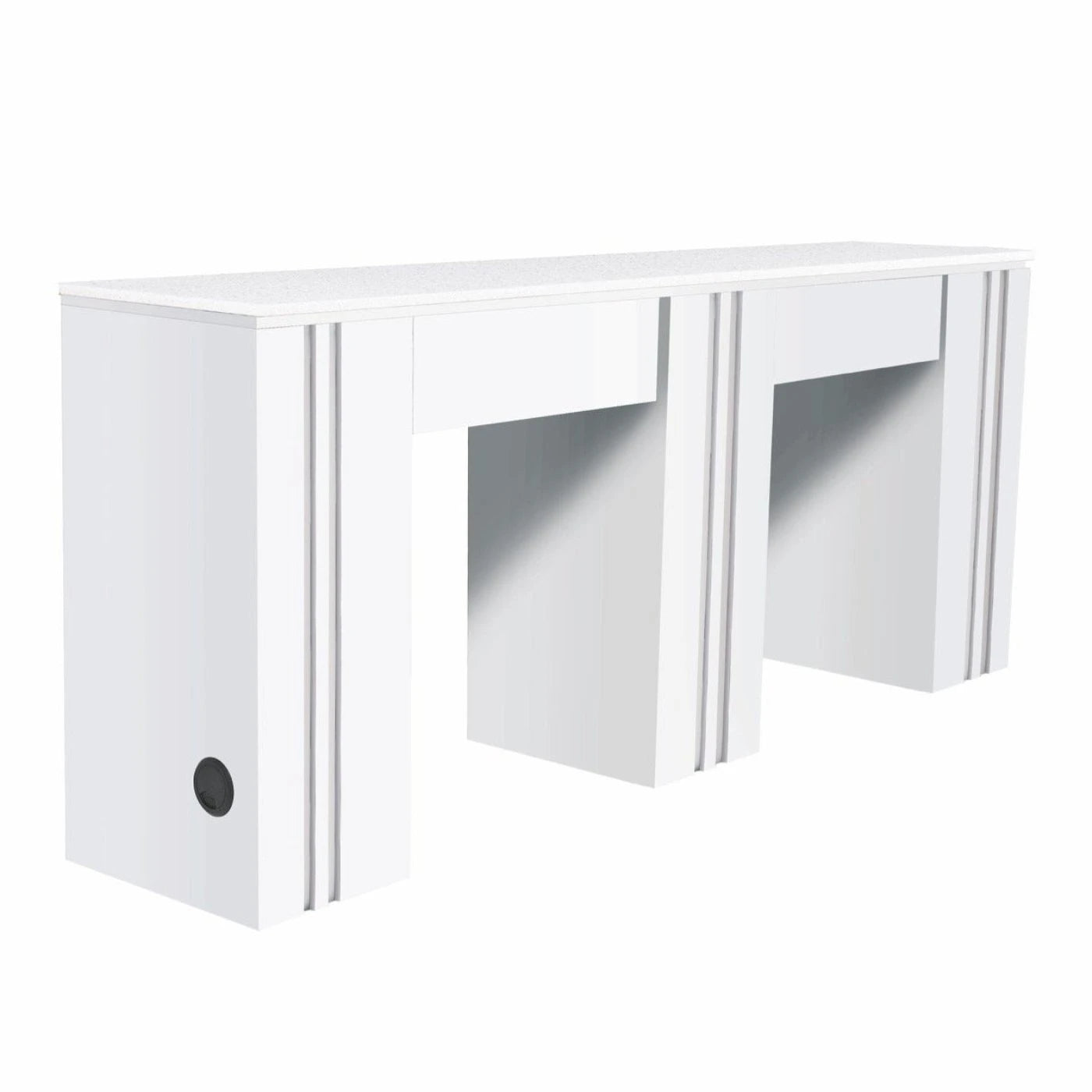 Enhance your salon's efficiency and aesthetics with the Whale Spa Double Manicure Table NM906D. This sturdy double manicure table offers two workstations while maintaining a custom look and saving space at only 71 inches in length. The smooth, sparkled, and durable Quartz top surface provides ample room for your technicians to work, ensuring a seamless and productive experience. Designed with several openings in the top and sides, this table allows for convenient placement of power cords and other equipment, making it an ideal choice for modern salons. Built with solid construction and sturdy materials, the NM906D stands up to many hours of use, ensuring long-lasting durability.
