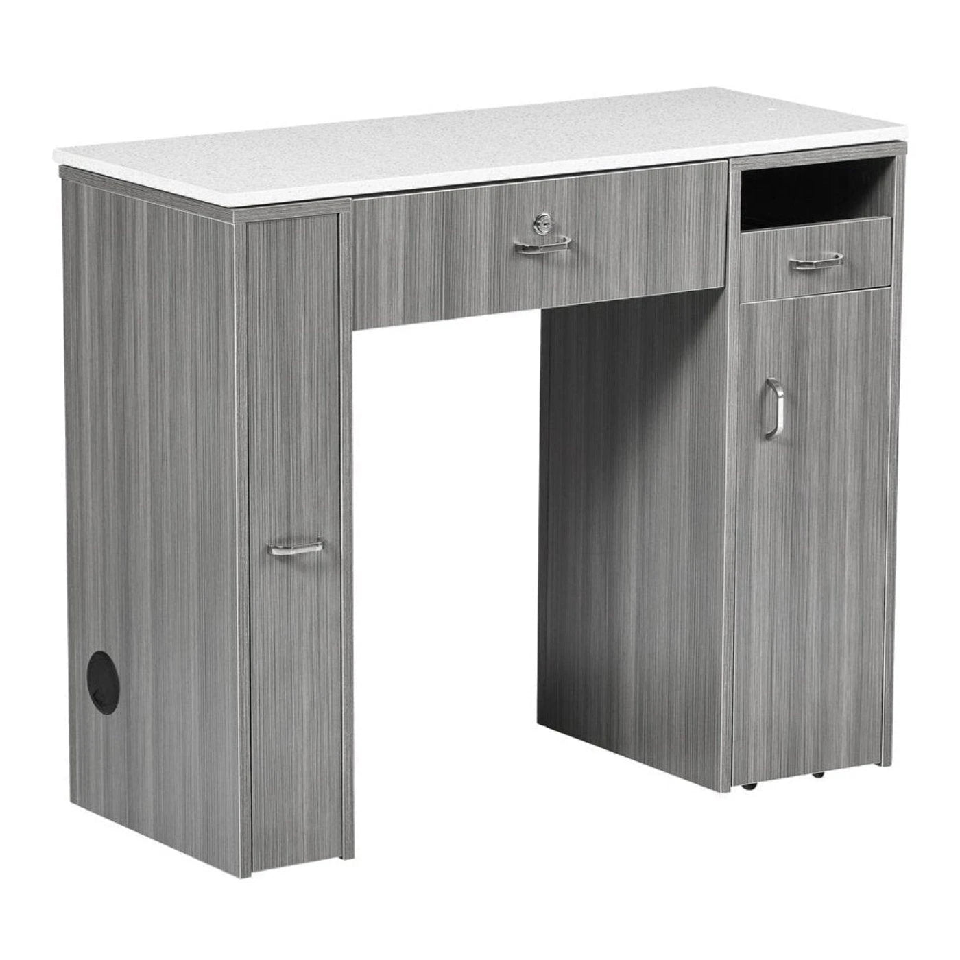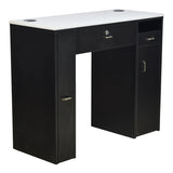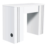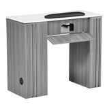 Crafted with a linear framework and stylish contrasting white inlays, the NM 901 exudes modern sophistication. Beyond its stunning appearance, this table is designed for optimal functionality. The spacious solid quartz work surface provides ample room for all essential manicure tools and products, ensuring a seamless workflow. Multiple openings allow for tidy organization of power cords and tools, enhancing efficiency during treatments. The wide knee well ensures comfortable seating for both clients and technicians, promoting a relaxing experience throughout the service.