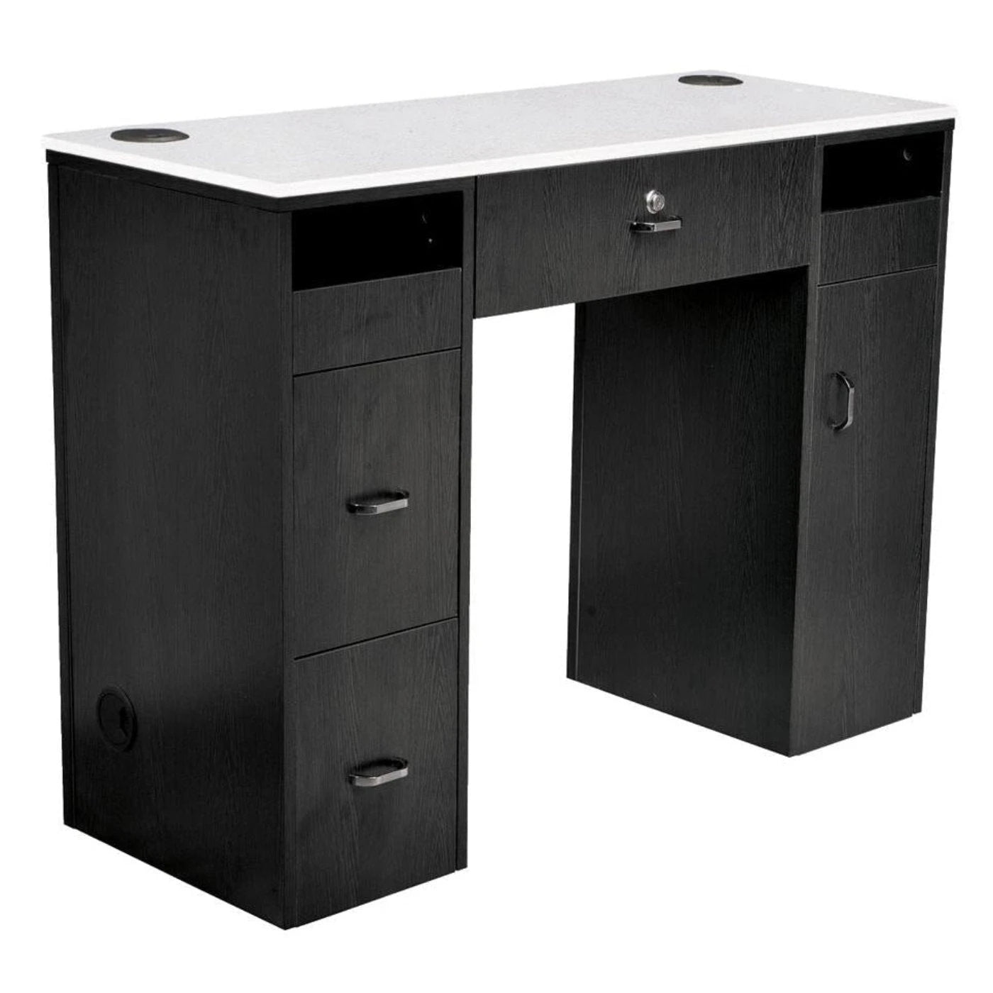 Durable Construction: Crafted from wood and laminate finished with solid quartz, this manicure table is built to withstand daily salon use, providing a sturdy and reliable workspace for manicure technicians.