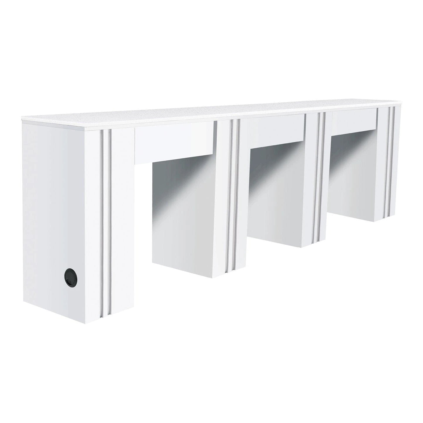 Upgrade your salon with the Whale Spa Triple Manicure Table NM906T, a perfect blend of elegance and functionality. This sturdy manicure table is designed to offer three workstations, providing ample space for your technicians to work efficiently. With a sleek, custom look, it saves space while ensuring durability and style.