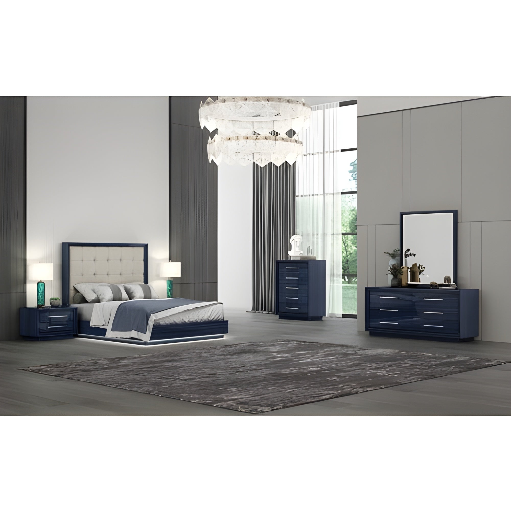 Elevate your bedroom decor with the Whiteline Modern Living Alexander Queen Bed in Blue/Light Grey Colour - BQ1937. This luxurious bed features a stunning high gloss sapphire blue lacquer that adds a touch of sophistication to any bedroom. The upholstered headboard in light grey faux leather complements the bold color of the bed frame, creating a visually striking and elegant centerpiece. Designed to offer both style and comfort, the Alexander bed includes a base with built-in LED lighting, adding a modern touch to your nighttime routine.