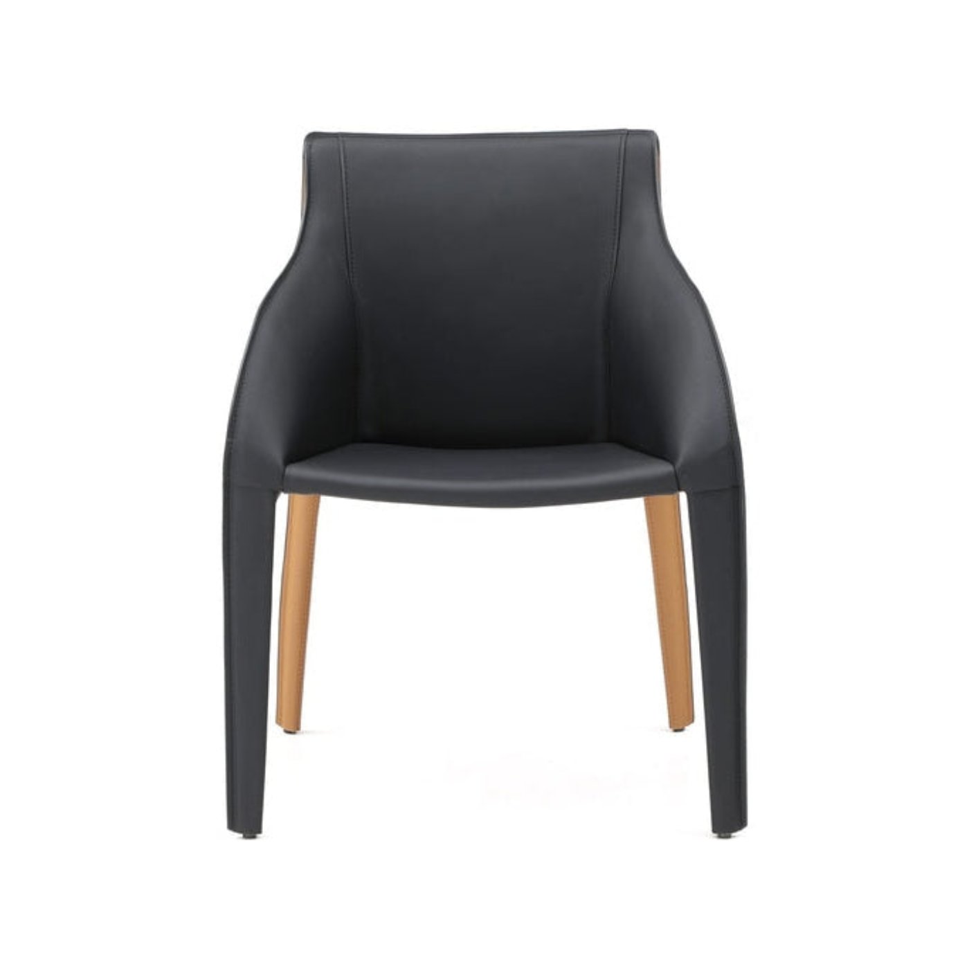 Introducing the Whiteline Modern Living Emory Dining Armchair - DAC1881P-BLK/BRN, a striking blend of elegance and comfort for your dining space. This armchair features a sophisticated design with its fully upholstered legs and a combination of black and brown faux leather. The front is wrapped in sleek black faux leather, while the back boasts a rich brown faux leather, creating a visually appealing contrast that enhances any dining setting.
