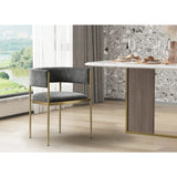 Discover the epitome of sophisticated design with the Whiteline Modern Living Envie Dining Armchair - DAC1821F. This armchair embodies lightness and elegance while preserving its sleek style and shape. Available in two striking combinations—light grey fabric with a black sanded coated steel frame or charcoal fabric with a gold brushed brass stainless steel frame—the Envie Dining Armchair complements any modern dining setup. Its refined aesthetic and high-quality materials ensure that it not only enhances the look of your dining area but also provides exceptional comfort.