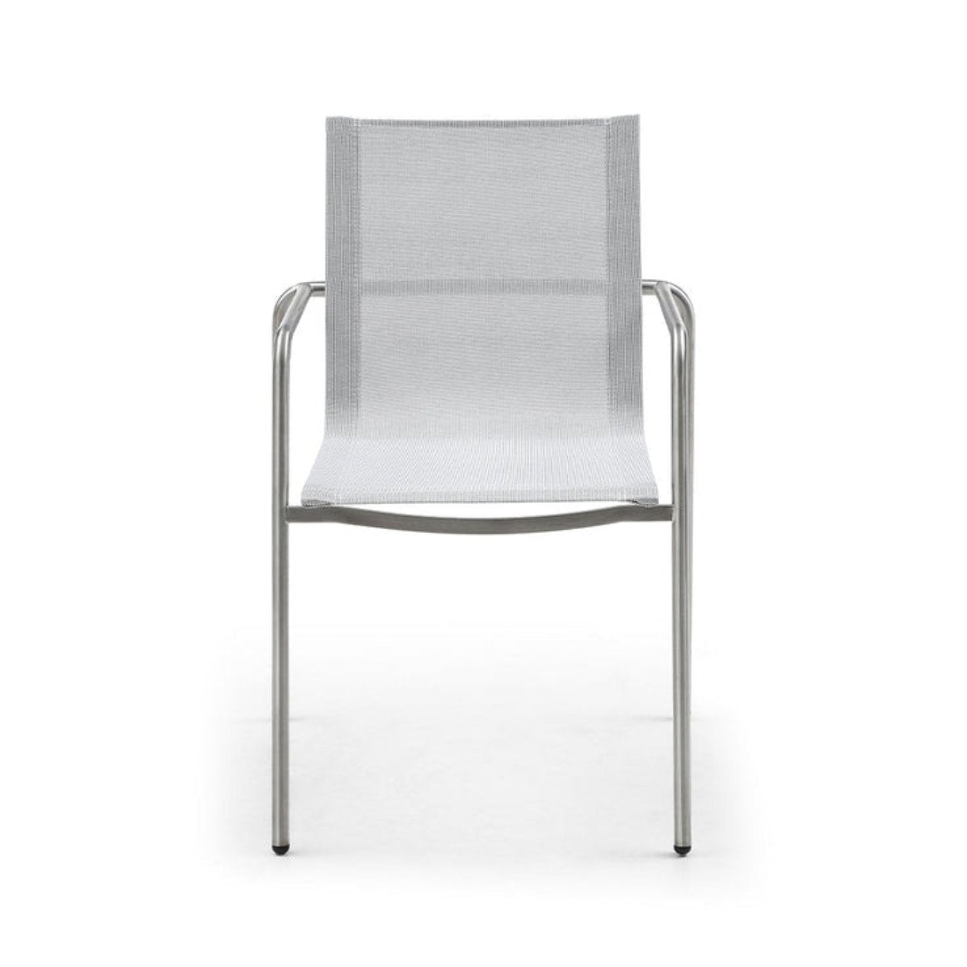 Elevate your outdoor dining experience with the Whiteline Modern Living Paola Outdoor Dining Armchair. Distinguished by its simplicity and sleek design, this armchair introduces elegance and character to any outdoor area. Crafted with a brushed silver stainless steel frame and a light grey Textilene seat and back, the Paola armchair combines durability with a contemporary aesthetic, making it a perfect addition to your outdoor furniture collection.