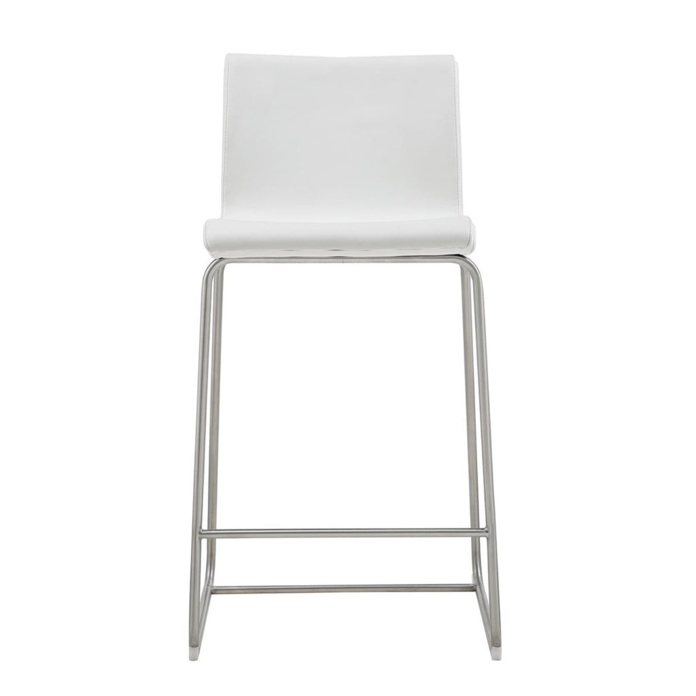 Elevate your modern living space with the Whiteline Mods Hayden Counter Stool, a perfect blend of luxury and contemporary design. Upholstered in sleek white faux leather, this counter stool exudes sophistication while offering exceptional comfort. The fixed seat height of 26 inches is ideal for countertops and bars, providing an elegant seating option for your kitchen or dining area. The brushed stainless steel legs add a touch of modernity and durability, seamlessly complementing any decor style.