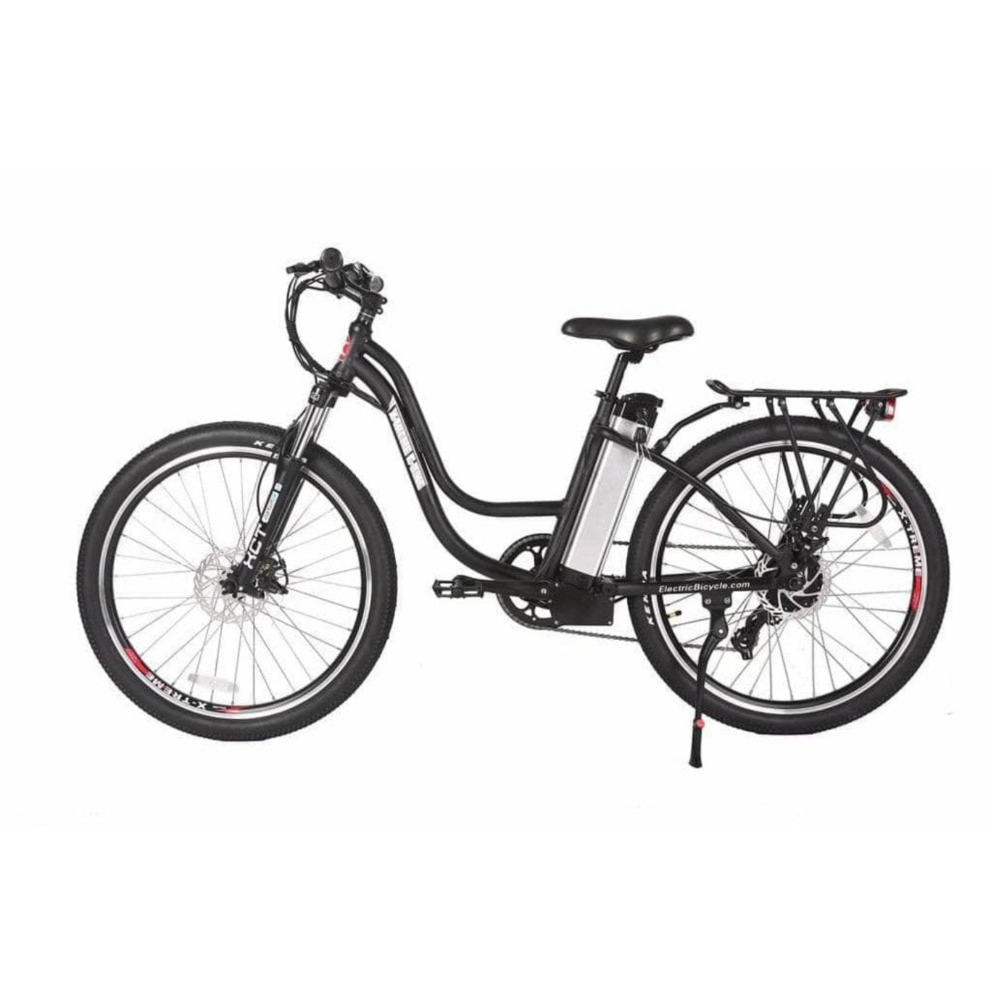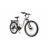 The Trail Climber Elite is a Lithium Battery powered Electric Bicycle with a step-through frame, running on a 300 Watt Zero Resistance rear hub motor. Made with all top of the line components this model includes a 7 Speed Shimano Tourney® Gears & Shifter System, 7 Lightweight Lithium 24 Volt 10.4 Amp (previously only 8 amps) LiPo4 Batteries, a 100% Aluminum Alloy Frame, fully Adjustable Seat, and a Suntour hydraulic front fork.